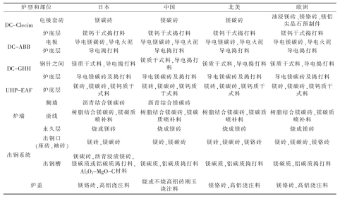 摘 要:由三根電極的普通交流電弧爐發(fā)展為超高功率(UHP)及一根電極的直流(DC)電弧爐,爐體結(jié)構(gòu)有一些改變。針對(duì)各部位的損毀因素,內(nèi)襯用的耐火材料也有所發(fā)展。例如普通電弧爐的爐頂用高鋁磚、爐墻鎂磚砌筑,而UHP及DC電弧爐采用大面積水冷爐頂、爐墻,爐頂三角區(qū)采用剛玉澆注料或預(yù)制件,爐墻用鎂碳磚,蝕損嚴(yán)重部位采用噴補(bǔ)作業(yè)。還介紹了日本等一些國(guó)家DC和UHP的各種爐型用耐火材料。煉鋼電弧爐是以電極端部和爐料之間發(fā)生的電弧為熱能進(jìn)行煉鋼的設(shè)備。電弧爐以廢鋼為爐料直接煉鋼,與礦石煉鐵后再煉鋼相比,基建投資少,節(jié)能60%、節(jié)水40%、減少?gòu)U氣排放86%、減少?gòu)U渣97%[1]。交流電弧爐歷史悠久,交流電是通過(guò)三根石墨電極輸入爐內(nèi),在電極下端與金屬料之間產(chǎn)生電弧,利用電弧高溫直接加熱爐料,使煉鋼過(guò)程得以進(jìn)行。供電功率越高,爐料熔化速度越快,降低能量消耗越多,因此出現(xiàn)超高功率(UHP)電弧爐。在超高功率的基礎(chǔ)上發(fā)展了直流(DC)電弧爐煉鋼。直流電弧爐是以一根石墨電極的端點(diǎn)為陰極,爐底為陽(yáng)極,石墨電極位于爐膛中心部位。與UHP相比設(shè)備結(jié)構(gòu)簡(jiǎn)單,建設(shè)費(fèi)用低,熔池中的電流與熱量分布比較均勻,不存在過(guò)熱區(qū)域,因此耐火材料損耗比較小、節(jié)能且噪音小等。目前,煉鋼電弧爐向大型化、控制自動(dòng)化方向發(fā)展。我國(guó)的電弧爐主要用來(lái)生產(chǎn)合金鋼。煉鋼水平與工業(yè)發(fā)達(dá)國(guó)家相比差距較大,如2015年我國(guó)電爐鋼占粗鋼總產(chǎn)量的6.1%,2020年有所提高,但也不超過(guò)10%,與世界平均水平的30%相比還有較大差距。我國(guó)已經(jīng)引進(jìn)先進(jìn)水平的UHP和DC電弧爐,隨著經(jīng)濟(jì)發(fā)展,工業(yè)化程度提高,必然伴以廢鋼資源數(shù)量增加,同時(shí)發(fā)展鐵礦石直接還原煉鐵技術(shù),代替廢鋼,增加電弧爐煉鋼的爐料,還有核電的發(fā)展,使電弧爐煉鋼有了物質(zhì)保證。電弧爐的內(nèi)襯是耐火材料構(gòu)成的,隨著UHP和DC技術(shù)的發(fā)展,需要新型優(yōu)質(zhì)耐火材料與之相配套。有人說(shuō)[2]:沒(méi)有優(yōu)質(zhì)爐襯、爐底耐火材料支持長(zhǎng)壽爐齡,超高功率電弧爐就無(wú)法發(fā)揮高效生產(chǎn)的優(yōu)勢(shì)。爐底耐火材料是直流電弧爐得以實(shí)現(xiàn)的必要條件,反映了煉鋼與耐火材料技術(shù)的互相影響,互為依存,在電弧爐煉鋼系統(tǒng)優(yōu)化生產(chǎn)中有不可分割的作用。1 電弧爐的結(jié)構(gòu)變化傳統(tǒng)的電弧爐由爐頂(又稱爐蓋)、爐墻、爐坡、爐底和出鋼槽構(gòu)成,全部用耐火材料構(gòu)筑,外包鋼制爐殼。爐墻一側(cè)設(shè)有爐門,另一側(cè)為出鋼口,并與出鋼槽相連。而UHP和DC電弧爐采用偏心爐底出鋼,使?fàn)t體由傾動(dòng)式改為固定式,爐底有供氣攪拌設(shè)置,爐頂安裝氧-燃料燒嘴,在爐底偏心位置設(shè)置出鋼口,代替出鋼槽。由于取消了傾動(dòng)設(shè)備,擴(kuò)大了水冷面積,緩和了爐襯的損毀,適當(dāng)降低了出鋼溫度,并縮短了出鋼時(shí)間,從而降低生產(chǎn)成本。爐墻采用鑲砌水冷箱式水冷套措施,其內(nèi)表面噴涂一層耐火涂料,使其掛渣形成保護(hù)層,可有效降低耐火材料消耗,但電耗可能增加。國(guó)外有的電弧爐功率達(dá)1 000 kV·A/t以上,爐墻壽命達(dá)2 000爐次以上,水冷爐蓋壽命達(dá)4 000爐次,降低耐火材料消耗60%以上。2 耐火材料內(nèi)襯的損毀因素電弧爐內(nèi)襯的耐火材料長(zhǎng)期處于高溫、熔渣侵蝕和急熱急冷狀態(tài)下,工作條件極其惡劣。在煉鋼的熔化期和氧化期,不致于因高溫?fù)p壞爐襯,但在還原期的鋼液溫度相當(dāng)高,又受電弧直接輻射(有時(shí)溫度達(dá)4 000℃以上),爐襯很容易造成熔融損壞。出完鋼裝料時(shí),爐襯溫度突然下降,裝完料開(kāi)始送電,溫度又逐漸升高,這種急冷急熱是爐襯剝落的直接原因,主要是爐頂容易剝落。耐火材料內(nèi)襯損毀的主要因素包括[3]:(1)化學(xué)侵蝕。FeO或渣中SiO2與耐火材料中的CaO、MgO之間的化學(xué)反應(yīng),使?fàn)t襯變?yōu)槿墼?,而?dǎo)致?lián)p毀。(2)耐火材料內(nèi)襯中的碳成分被含氧成分(如FeO、O2、MgO等)氧化,導(dǎo)致耐火材料脫碳而損毀。(3)沖刷和機(jī)械沖擊。鋼水或熔渣流過(guò)耐火材料表面,以物理性磨損或沖刷爐襯,而導(dǎo)致內(nèi)襯損毀;在出鋼口、渣線、電極口或排氣口平臺(tái)等沖刷嚴(yán)重,廢鋼等爐料吊入往往撞擊爐襯而損毀。(4)水化。在生產(chǎn)過(guò)程中,往往會(huì)出現(xiàn)爐頂或爐墻漏水或滲水,還有水蒸氣,與堿性耐火材料中的MgO、CaO進(jìn)行水化反應(yīng),使內(nèi)襯損毀。3 電弧爐用耐火材料根據(jù)電弧爐的結(jié)構(gòu),由于各部位承受的熱負(fù)荷大小不同,與熔渣、鋼水接觸作用及機(jī)械損壞程度存在差異,不同部位必須采用不同的耐火材料[4]。3.1 爐頂(蓋)我國(guó)中小電弧爐普遍采用燒成或不燒高鋁磚,局部用高鋁質(zhì)或剛玉質(zhì)不定形耐火材料預(yù)制件。大型超高功率電弧爐和直流電弧爐采用水冷技術(shù),除三角區(qū)外,爐頂耐火材料不是關(guān)鍵。三角區(qū)由于強(qiáng)烈熱震及電極熱